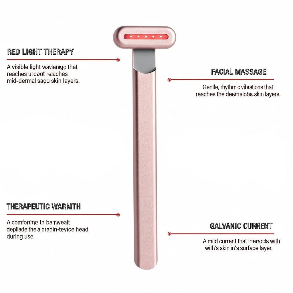 • 4-in-1 Red Light Therapy Wand for Glowing Skin: Combines Red Light Therapy to smooth fine lines, Galvanic Current for deeper skincare absorption, Therapeutic Warmth to soothe under-eyes, and Facial Massage to reduce puffiness, all in one sleek skincare device.